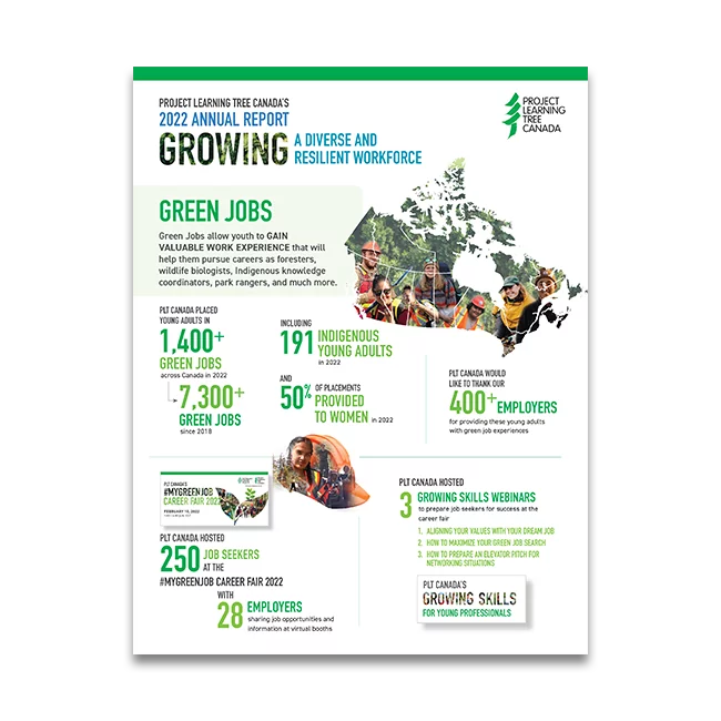 We are tremendously proud to have supported 7,600+ Green Jobs since 2018, providing 50% of placements to women and 15% of our placements to Indigenous youth. Since 2018, PLT Canada has placed 1,900 young adults facing one or more barriers to employment, such as youth self-identifying as involuntary NEET (not in employment, education, or training), youth living with a disability, and members of the 2SLGBTQIA+ community, into Green Jobs. We have also delivered 11 mentorship cohorts with 600+ participants and developed many environmental education products in 2023, like the Explore Your Environment: K-8 Activity Guide and Forest Quest.