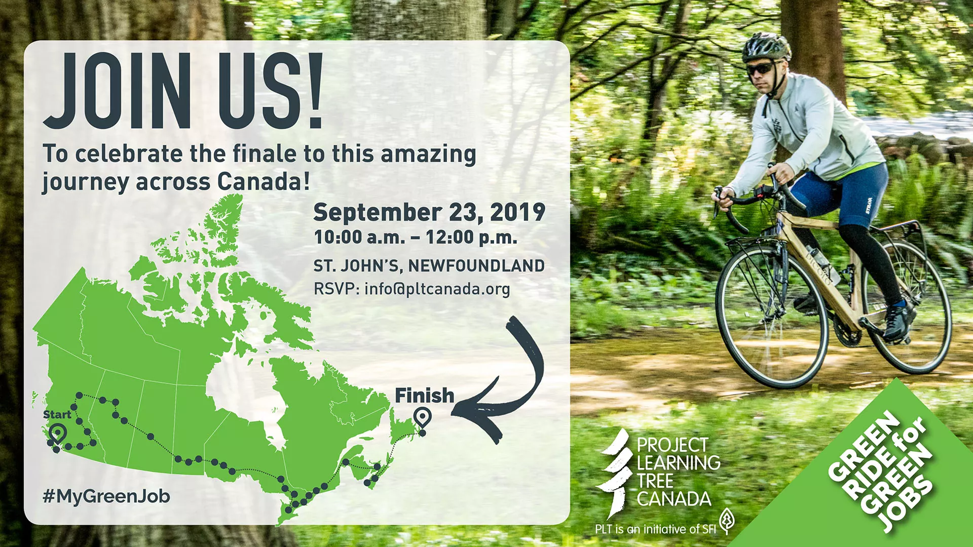 The grand finale of the Green Ride for Green Jobs will take place in St. John’s, Newfoundland on September 23 at the Terry Fox Mile 0 Site from 10:00 to 12:00 (Newfoundland Time). If you’re in St. John’s, come out and celebrate with us—RSVP: info@pltcanada.org. You can also RSVP to the event on Facebook. Zac Wagman, our “green rider,” is finally crossing the finish line on his wooden bike after his epic cross?Canada journey from Victoria that began in May. Zac has biked over 9,000 km this summer, visiting more than 100 communities and sharing countless stories of youth working in green jobs in the great outdoors. Learn more about the Green Ride for Green Jobs. We are celebrating Zac’s achievement in time for National Forest Week—a celebration of Canada’s forest heritage that raises awareness of this valuable and renewable resource. |