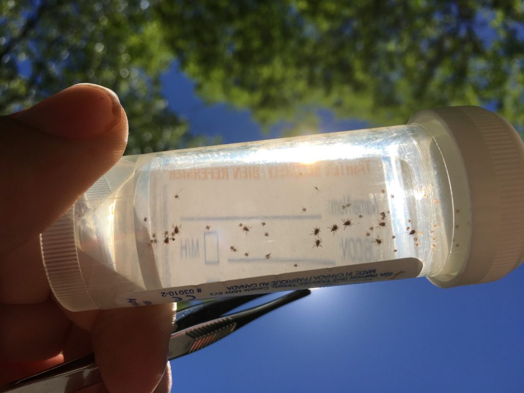 The ticks sent to the PHAC National Microbiology Lab in Winnipeg are tested for tick-borne pathogens like Lyme Disease. Munn’s goal is to use this data to be better able to predict the blacklegged ticks’ spread and infection, looking at variables such as forest fragmentation, seasonal precipitation, and presence of hosts. He is also trying to determine if the ruffed and spruce grouse are potentially influential hosts that impact the spread of ticks. Their hearts are collected from local hunters and tested for tick-borne pathogens to determine if there is a link between the birds and ticks and if they are infected at the same percentage. Robar they’ve been typically finding the blacklegged ticks in deciduous hardwood stands, places under forest cover and with leaf litter because the ticks are less likely to dry out. Munn and Robar go through the site of the day and stop in spots where they’re likely to be found, collect the ticks and record information about the surrounding area and conditions such as the forest composition, shrub layer, herbaceous layer, cloud coverage, and temperature.