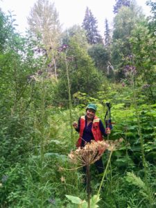 Carleen, jeune stagiaire en aménagement forestier, apprend à utiliser une radiosonde GPS haute précision dans un projet de recherche réalisé dans la forêt expérimentale Aleza Lake.