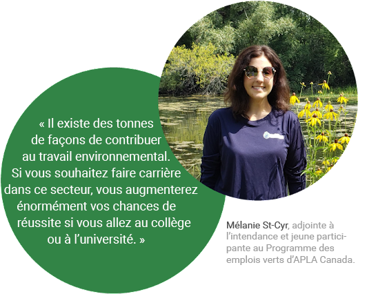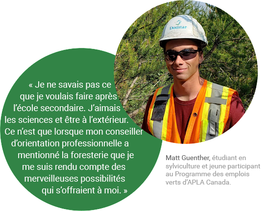 Découvrez les histoires de jeunes comme vous qui occupent déjà des emplois verts. La section Profils de jeunes au travail présente des jeunes qui ont participé à un programme d'été des emplois verts d’APLA Canada et qui sont en voie de devenir de futurs leaders dans le domaine de la forêt et de la conservation.